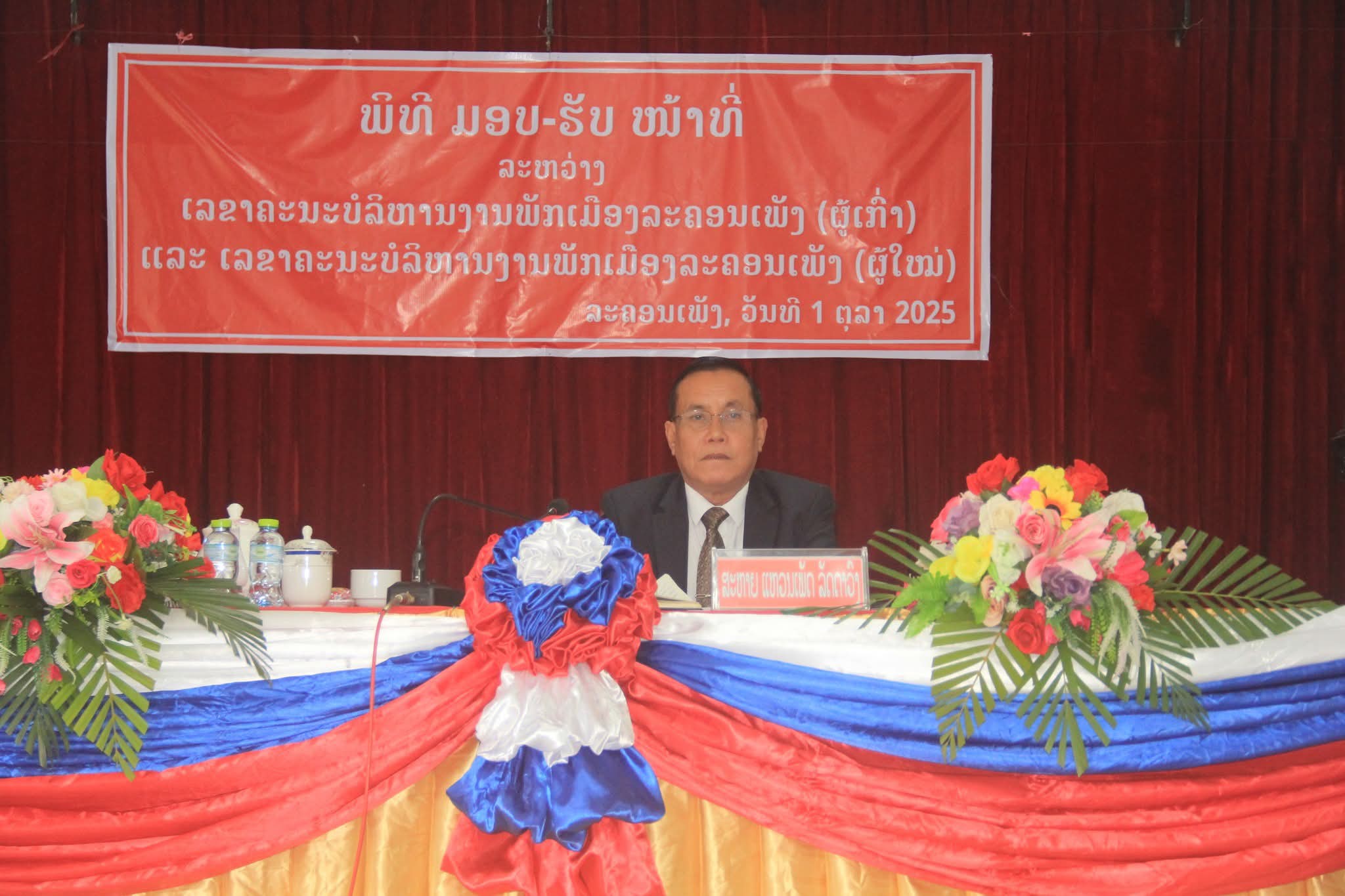 ຕອນເຊົ້າວັນທີ 1 ຕຸລາ 2025, ທີ່ສະໂມສອນເມືອງລະຄອນເພັງ ໄດ້ຈັດພິທີມອບ-ຮັບໜ້າທີ່ ລະຫວ່າງ ເລຂາຄະນະບໍລິຫານງານພັກເມືອງລະຄອນເພັງ ຜູ້ເກົ່າ ແລະ ຜູ້ໃໝ່, ໂດຍການເຂົ້າຮ່ວມຂອງ ສະຫາຍ ແຫວນເພັດ ລັດດາວົງ ຄະນະປະຈຳພັກແຂວງສາລະວັນ, ມີບັນດາສະຫາຍກໍາມະການພັກແຂວງ, ພະແນກການຂັ້ນແຂວງ, ຮອງເລຂາຄະນະບໍລິຫານງານພັກເມືອງ, ຄະນະປະຈໍາພັກເມືອງ, ການນຳຂັ້ນສູງຈາກເມືອງອ້ອມຂ້າງ, ບັນດາສະຫາຍກໍາມະການພັກເມືອງ, ຫົວໜ້າ-ຮອງຫົວໜ້າຫ້ອງການ, ອົງການທຽບເທົ່າ, ອາດີດການນຳຂັ້ນສູງຂອງເມືອງ ຕະຫຼອດພະນັກງານສະມາຊິກພັກເຂົ້າຮ່ວມ.