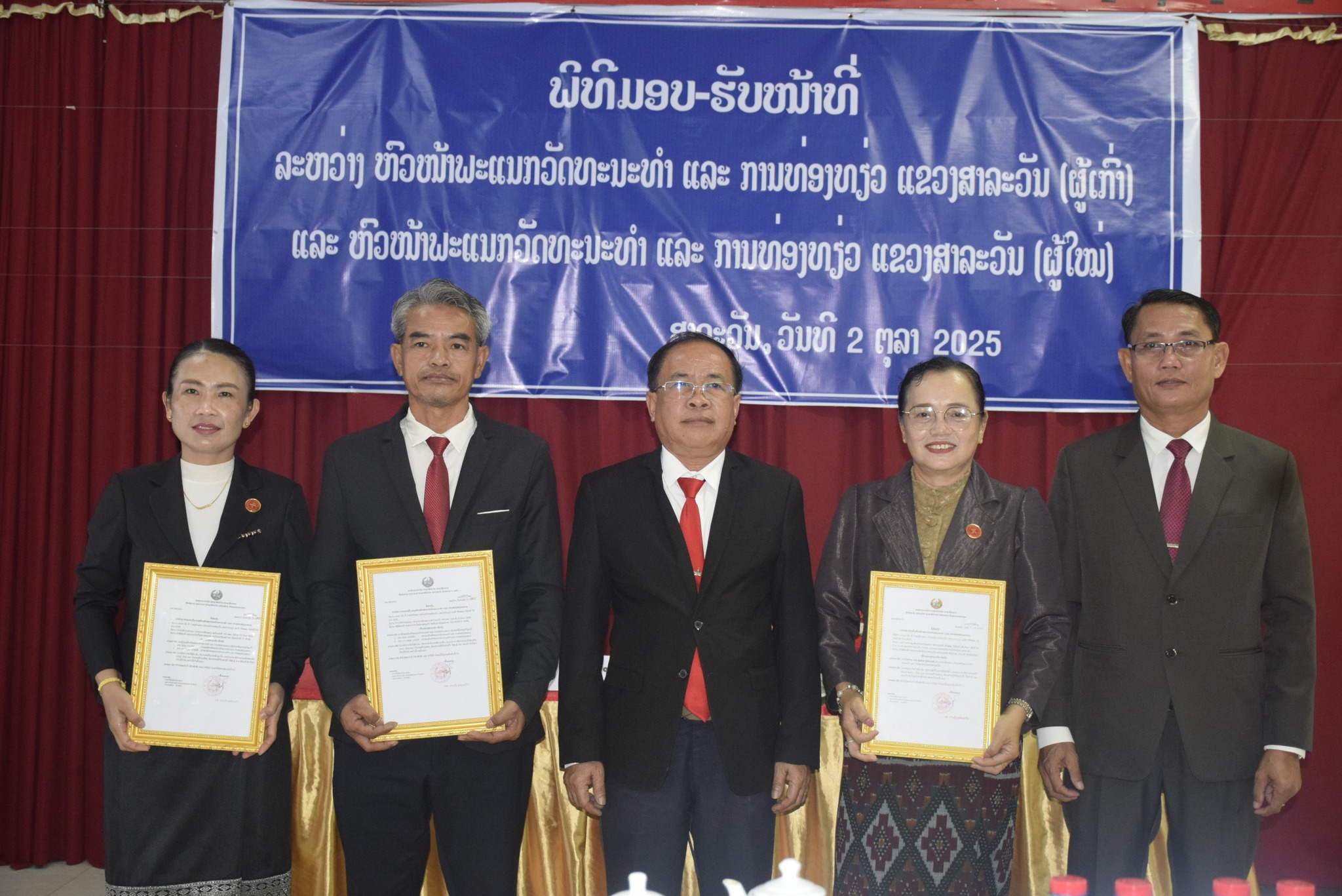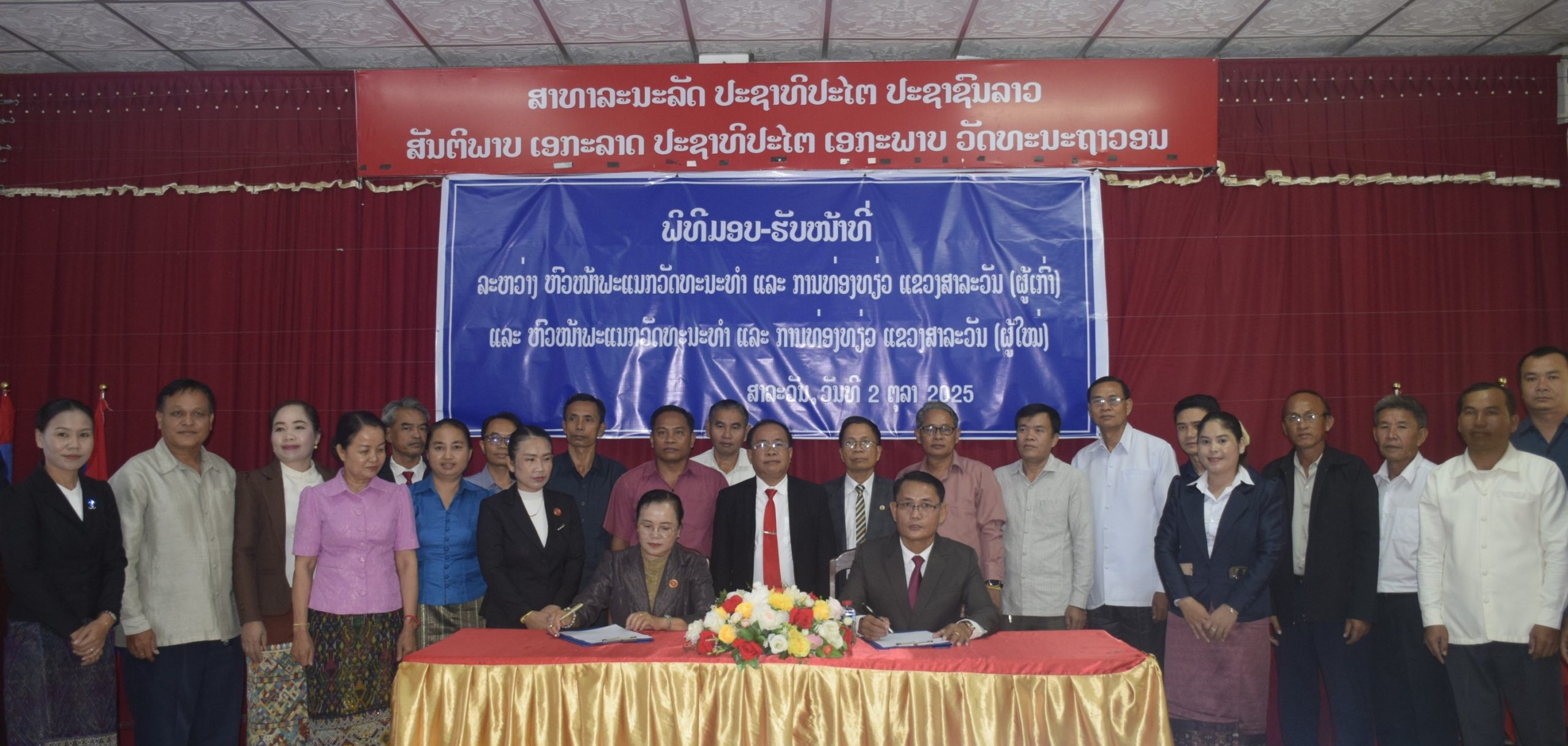 ວັນທີ 2 ຕຸລາ 2025 ພະແນກວັດທະນະທໍາ ແລະ ການທ່ອງທ່ຽວ ແຂວງສາລະວັນ ໄດ້ຈັດພິທີມອບ-ຮັບຫົວຫນ້າພະແນກວັດທະນະທໍາ ແລະ ການທ່ອງທ່ຽວແຂວງ (ຜູ້ເກົ່າ) ແລະ ຫົວຫນ້າພະແນກວັດທະນະທໍາ ແລະ ການທ່ອງທ່ຽວແຂວງ (ຜູ້ໃຫມ່) ຢູ່ທີ່ຫ້ອງປະຊຸມຂອງຕົນ ໂດຍໃຫ້ກຽດເປັນປະທານຂອງ ທ່ານ ສົມສັກ ທົງຄໍາຫານ ຄະນະປະຈໍາພັກແຂວງ ປະທານກວດກາແຂວງ; ມີ ທ່ານ ມະໄລວອນ ສີປະເສີດ ຫົວຫນ້າພະແນກວັດທະນະທໍາ ແລະ ການທ່ອງທ່ຽວແຂວງ (ຜູ້ເກົ່າ); ທ່ານ ນາງ ສູນໄຖ ໄຊຍະແສງ ຫົວຫນ້າພະແນກວັດທະນະທໍາ ແລະ ການທ່ອງທ່ຽວແຂວງ (ຜູ້ໃຫມ່); ມີບັນດາທ່ານຄະນະພະແນກ, ຫົວຫນ້າ-ຮອງຫົວຫນ້າຂະແຫນງ, ຫົວຫນ້າຫ້ອງການວັດທະນະທໍາ ແລະ ການທ່ອງທ່ຽວ 8 ເມືອງ; ແຂກຖືກເຊີນອ້ອມຂ້າງ ແລະ ພະນັກງານ-ລັດຖະກອນ ພາຍໃນພະແນກເຂົ້າຮ່ວມ.