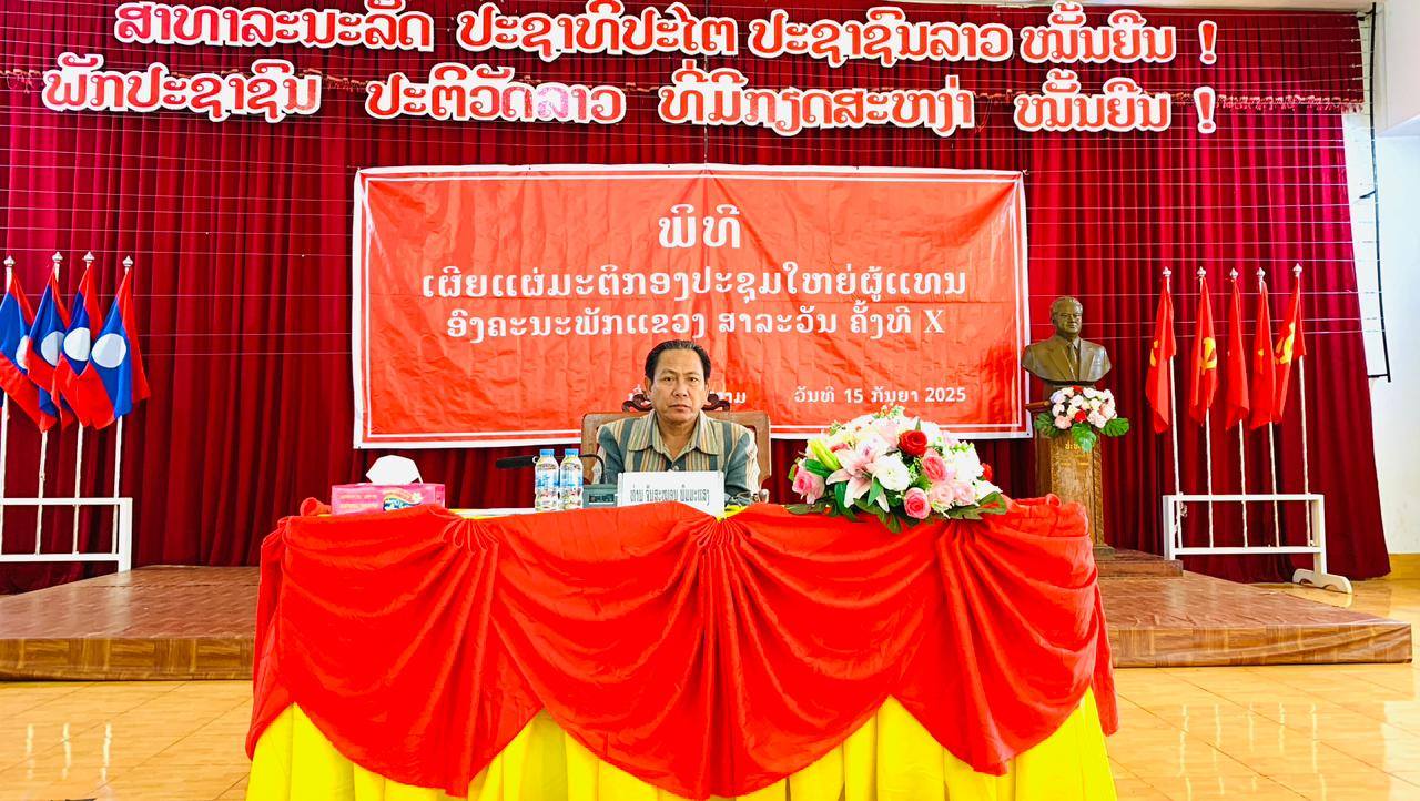 ສະຫາຍ ຈັນສະໝອນ ພົມມະແສງ ຄະນະປະຈໍາພັກແຂວງ ຫົວໜ້າຄະນະໂຄສະນາອົບຮົມ ແຂວງສາລະວັນ ກໍ່ໄດ້ເຜີຍແຜ່ມະຕິກອງປະຊຸມໃຫຍ່ຜູ້ແທນ ແຂວງສາລະວັນ ຄັ້ງທີ X ທີ່ໄດ້ໄຂຂື້ນຢ່າງເປັນທາງການ ເຊີ່ງໄດ້ດໍາເນີນແຕ່ວັນທີ 6-7 ສິງຫາ 2025, ຢູ່ສະໂມສອນຂອງແຂວງ, ໂດຍເປັນປະທານຂອງ ສະຫາຍ ປອ ດາວວົງ ພອນແກ້ວ ກໍາມະການສູນກາງພັກ, ເລຂາຄະນະບໍລິຫານງານພັກແຂວງ ເຈົ້າແຂວງ ສາລະວັນ, ກອງປະຊຸມຮູ້ສຶກເປັນກຽດຕ້ອນຮັບ ສະຫາຍ ພົນເອກ ຈັນສະໝອນ ຈັນຍະລາດ ກໍາມະການກົມການເມືອງສູນກາງພັກ, ຄະນະເລຂາທິການສູນກາງພັກ ຮອງນາຍົກລັດຖະມົນຕີ, ກອງປະຊຸມຄັ້ງນີ້ມີຜູ້ແທນເຂົ້າຮ່ວມທັງໝົດ 447 ສະຫາຍ, ຍິງ 58 ສະຫາຍ, ໃນນັ້ນຜູ້ແທນສົມບູນ 363 ສະຫາຍ, ຍິງ 54 ສະຫາຍ, ມາຈາກຂະເເໜງການ, ກົມກອງອ້ອມຂ້າງແຂວງ ແລະ 8 ເມືອງ, ທີ່ເປັນຕົວແທນໃຫ້ແກ່ສໍາມະຊິກພັກທັງໝົດໃນທົ່ວແຂວງສາລະວັນ, ຈໍານວນ 16.839 ສະຫາຍ, ຍິງ 4.051 ສະຫາຍ, ມີແຂກຖືກເຊີນເຂົ້າຮ່ວມທັງໝົດ 84 ສະຫາຍ, ຍິງ 4 ສະຫາຍ. ກອງປະຊຸມຄັ້ງປະຖົມມະລຶກ ຂອງຄະນະບໍລິຫານງານພັກ ເເຂວງສາລະວັນ ຄັ້ງທີ X ໄດ້ເປັນເອກະສັນ ເລືອກຕັ້ງເອົາຄະນະປະຈໍາພັກແຂວງຈໍານວນ 11 ສະຫາຍ, ຍິງ 1 ສະຫາຍ, ປະຊາມະຕິເອົາເລຂາ,ຮອງເລຂາຄະນະບໍລິຫານພັກແຂວງ ແລະ ເລືອກຕັ້ງເອົາປະທານ,ຮອງປະທານຄະນະກວດກາພັກແຂວງ ພ້ອມທັງກອງປະຊຸມຍັງໄດ້ເລືອກຕັ້ງເອົາຜູ້ແທນສົມບູນ ແລະ ສໍາຮອງໄປຮ່ວມກອງປະຊຸມໃຫຍ່ຜູ້ແທນທົ່ວປະເທດຄັ້ງທີ XII ຂອງພັກ ເຊີ່ງມີຜູ້ສະມັກທັງໝົດຈໍານວນ 31 ສະຫາຍ, ຍິງ 3 ສະຫາຍ, ເລືອກໄດ້ຈໍານວນ 26 ສະຫາຍ, ຍິງ 3 ສະຫາຍ, ອີກ 5 ສະຫາຍ ເປັນຜູ້ແທນສໍາຮອງ.